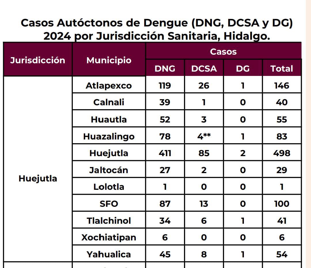 Según se especifica en los datos oficiales, los casos autóctonos de Dengue que se tienen en la Jurisdicción Sanitaria 4 en Huejutla, son las siguientes: Atlapexco 146 casos, Calnali 40, Huautla 55. Por su parte, Huazalingo avanza con 83 casos, Huejutla de Reyes al frente con 498, Jaltocán con 29, Lolotla 1, San Felipe Orizatlán 100, Tlanchinol 41, Xochiatipan 6 y Yahualica con 54 casos positivos.
