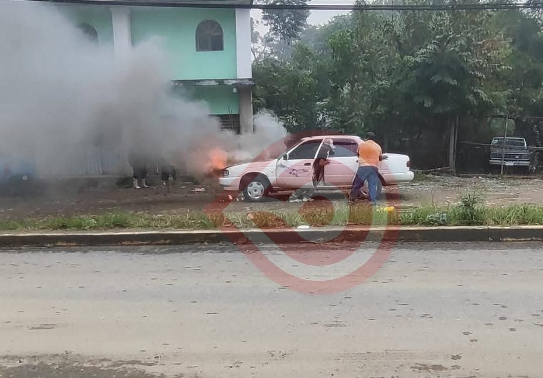 Huejutla, Hgo.- Por un corto circuito en el motor se quemó un automóvil, sobre la vía estatal Huejutla – Macuxtepetla, a la altura de la comunidad de Tepexititla; ante la mirada del chófer y su acompañante en minutos gigantescas llanas consumieron la parte del cofre de la unidad, el fuego fue controlado por vecinos con cubetadas de agua y más tarde se sumaron los bomberos.