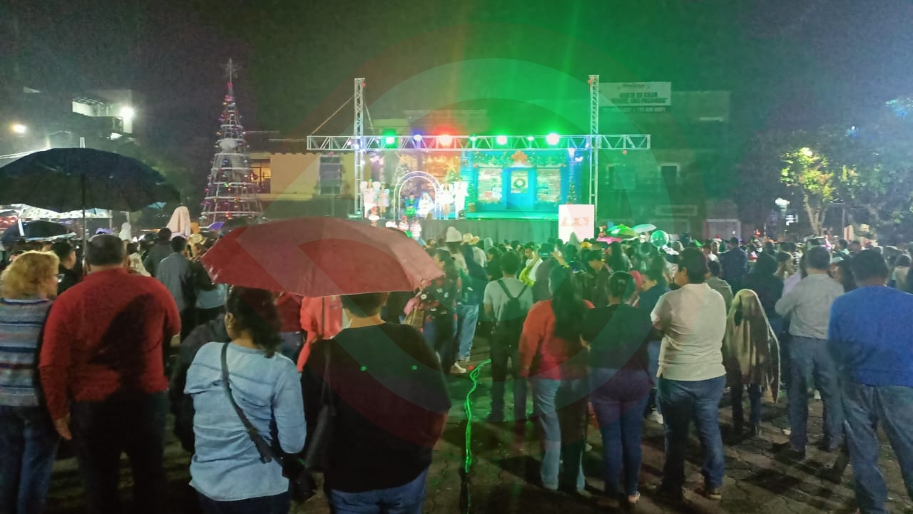 Huejutla de Reyes, Hgo.- A pesar de la lluvia que se registró durante la noche del sábado, familias disfrutaron del espectáculo de fuegos pirotécnicos, el desfile y de la viña navideña.