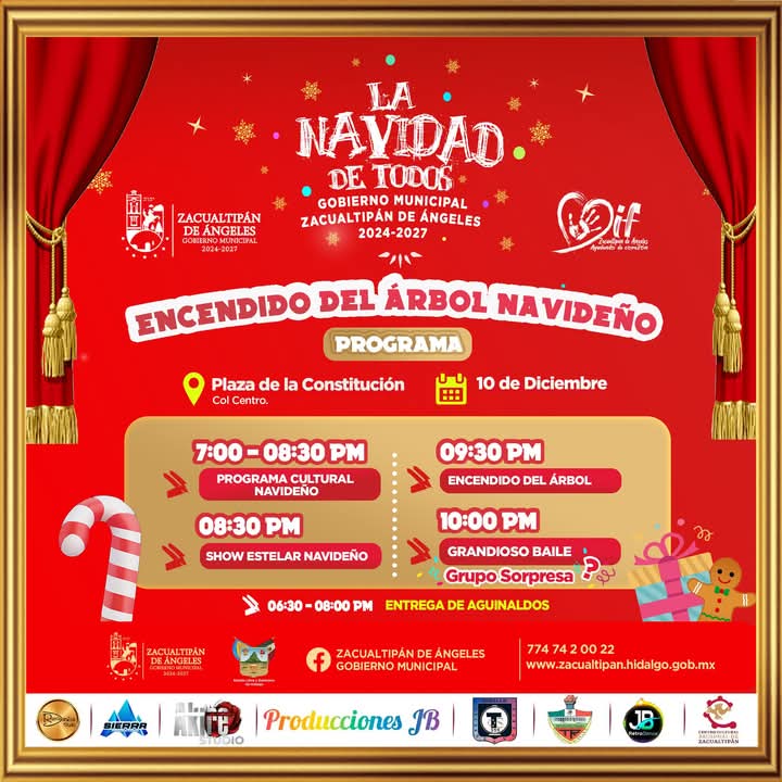 Zacualtipán de Ángeles, Hgo._El H. Ayuntamiento de Zacualtipán tiene el honor de invitar a todas las familias de la región al tradicional encendido del árbol navideño, un evento que marca el inicio de las festividades decembrinas bajo el lema “La Magia de la Navidad llega a la Sultana de la Sierra”. Esta celebración, organizada por la presidencia municipal, junto al Sistema Municipal DIF, promete ser una experiencia inolvidable para todos los asistentes.