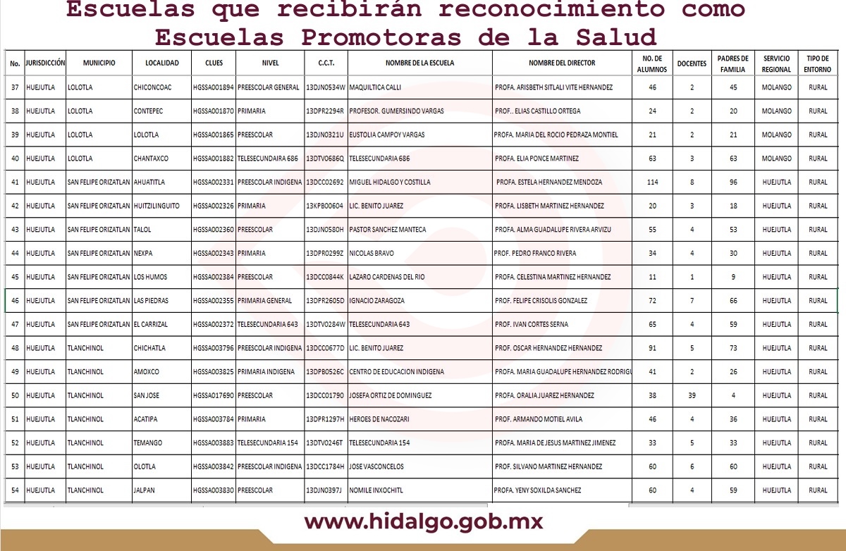 La Estrategia Nacional de Salud Escolar, implementada en coordinación con la Secretaría de Salud y la Secretaría de Educación Pública (SEPH), busca fomentar estilos de vida saludables y mejorar los entornos escolares para garantizar que se conviertan en espacios promotores de la salud.
