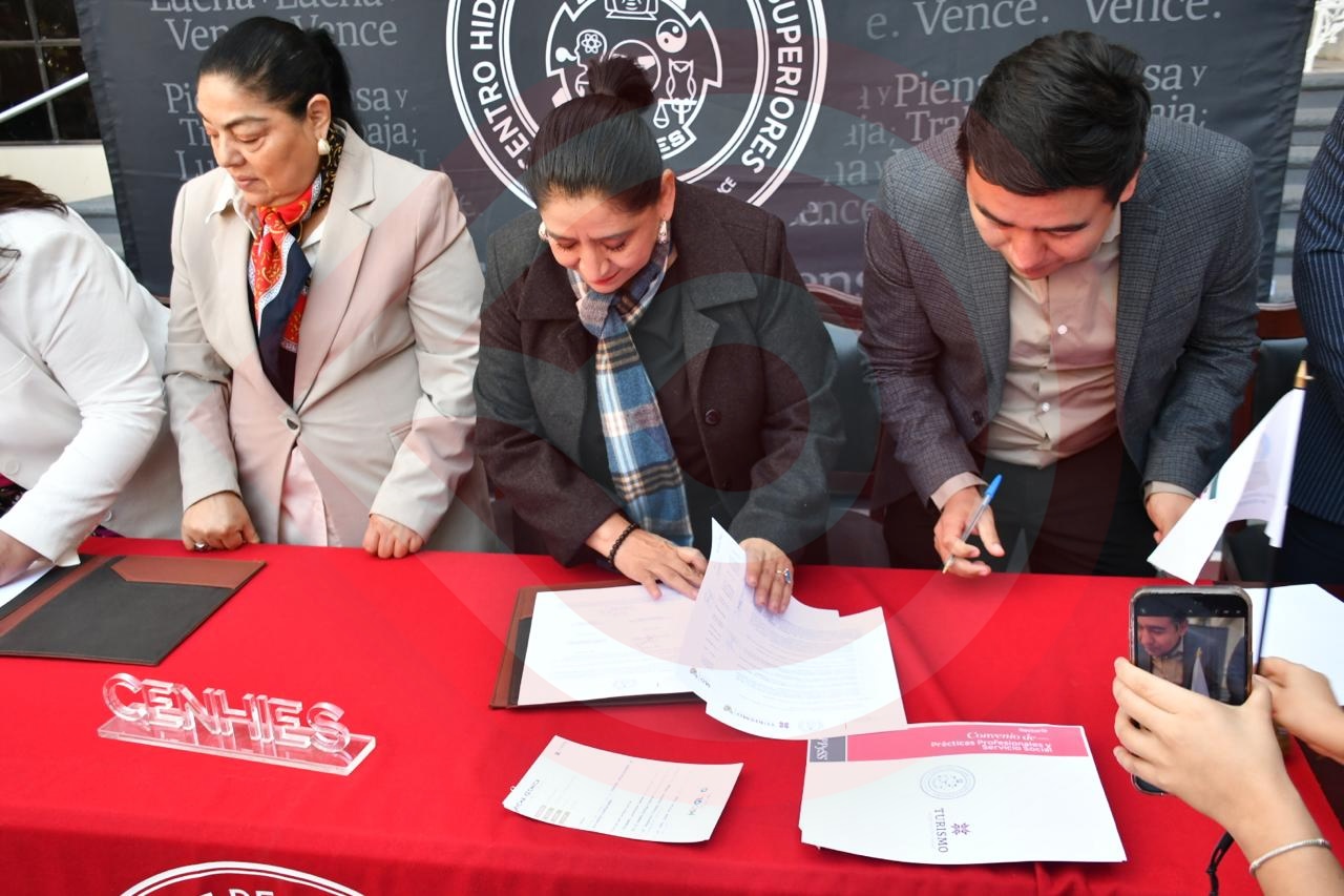 Pachuca, Hgo.- Con el objetivo de promover una sólida formación profesional para alumnos y ex alumnos, la Secretaría de Turismo del estado de Hidalgo (SECTURH) signó un convenio de colaboración con el Centro Hidalguense de Estudios Superiores (CENHIES).