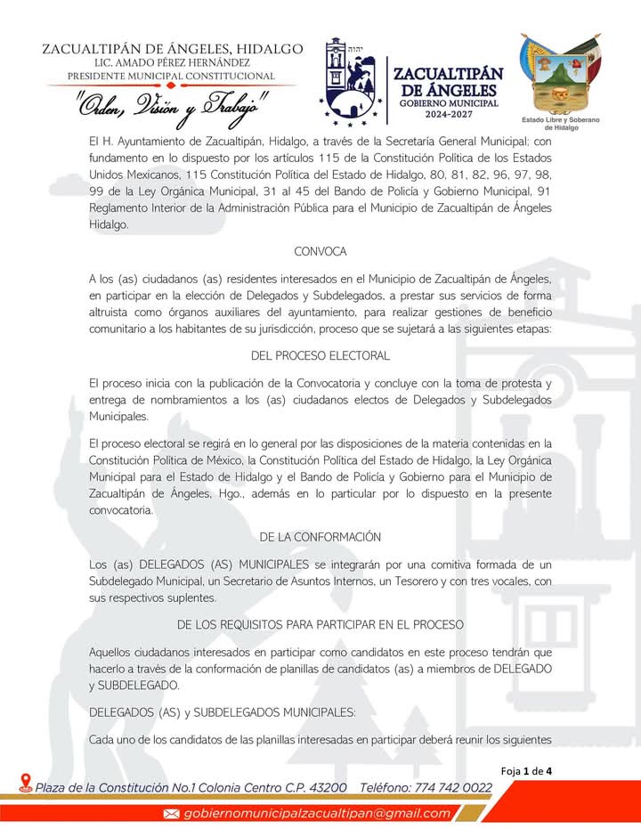 Zacualtipán de Ángeles, Hgo.- Autoridades municipales emitieron la convocatoria para la elección de delegados y subdelegados municipales, la cual tiene como fecha límite el próximo 19 de diciembre del 2024, para los registros de quienes aspiren al cargo.