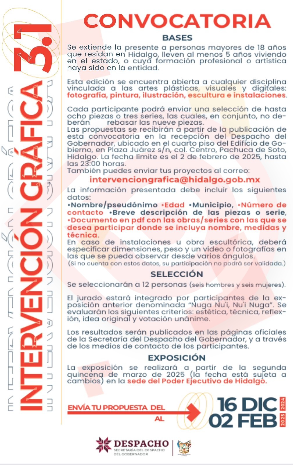 Las propuestas se recibirán del lunes 16 de diciembre al 2 de febrero de 2025 en la recepción del Despacho del Gobernador, ubicado en el cuarto piso del edificio del Poder Ejecutivo de Hidalgo, con dirección en Plaza Juárez s/n, colonia Centro, en Pachuca. También se pueden enviar los proyectos al correo intervenciongrafica@hidalgo.gob.mx.