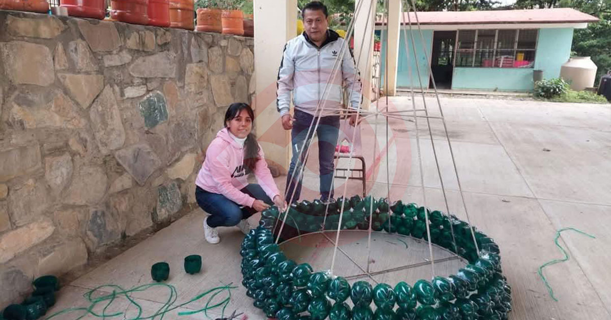 Jaltocán, Hgo.- Personal docente de la Escuela Primaria “Cinco de Mayo” del municipio de Jaltocán, con gran creatividad construyeron un árbol de navidad con botellas recicladas de plástico.