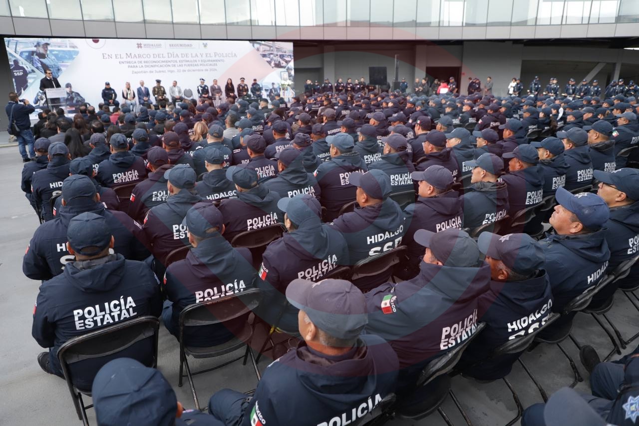 Pachuca, Hgo.- En el marco del Día de la y el Policía, el gobierno de Hidalgo, a través de la Secretaría de Seguridad Pública (SSPH), realizó la entrega de reconocimientos y equipamiento, así como el anunció de un aumento salarial para conmemorar la fecha, en la que se enalteció la labor y el compromiso de los elementos estatales.