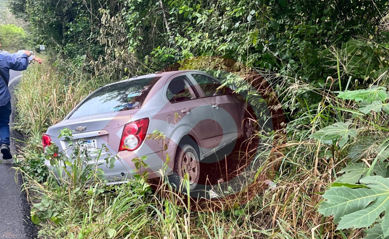 Chalma, Ver.- Conductor de un automóvil al perder el control de su volante ante el exceso de velocidad y humedad en la cinta asfáltica, se salió de la carretera hasta terminar en el monte, accidente que dejó solo daños, sobre la vía Huejutla – Chalma.