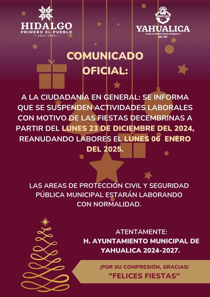 Yahualica, Hgo.- El Ayuntamiento que preside Francisca Lara Velázquez, suspendió el pasado lunes de manera temporal las labores administrativas en todas las dependencias, lo anterior, por motivo de los festejos de Navidad y Año Nuevo.