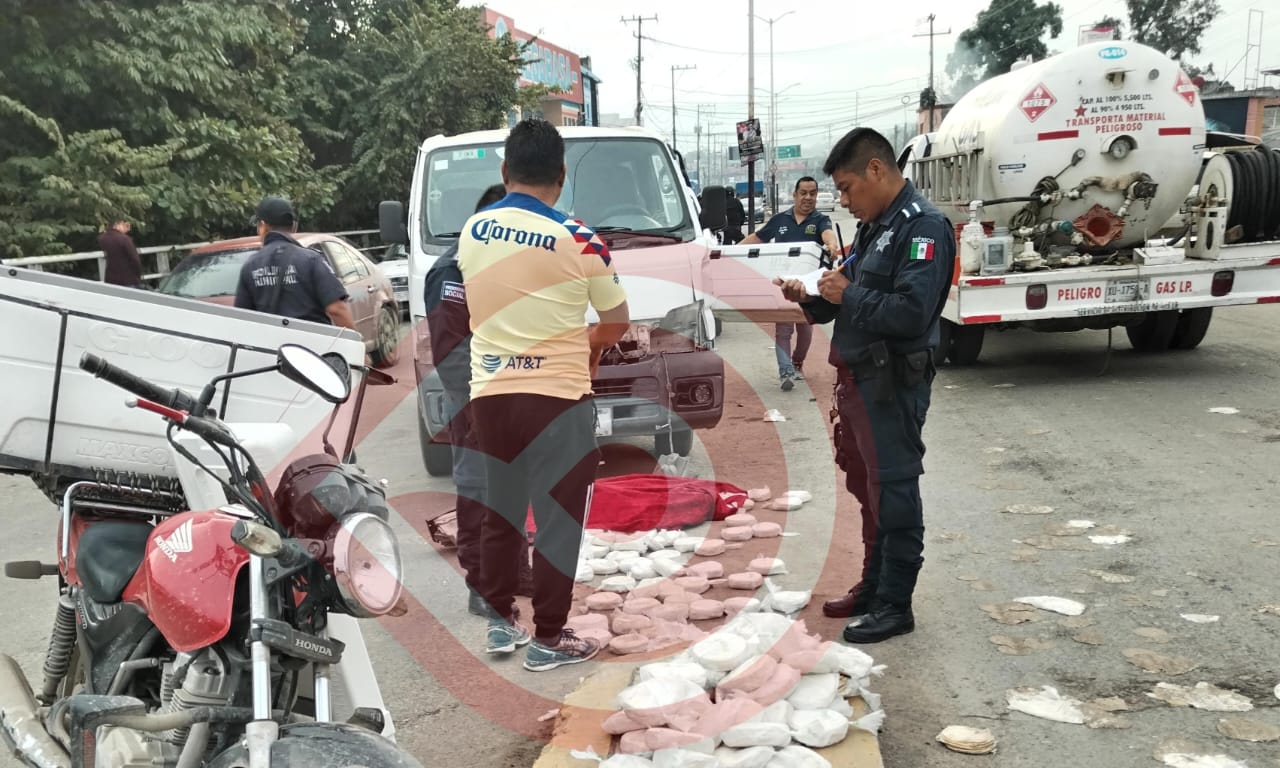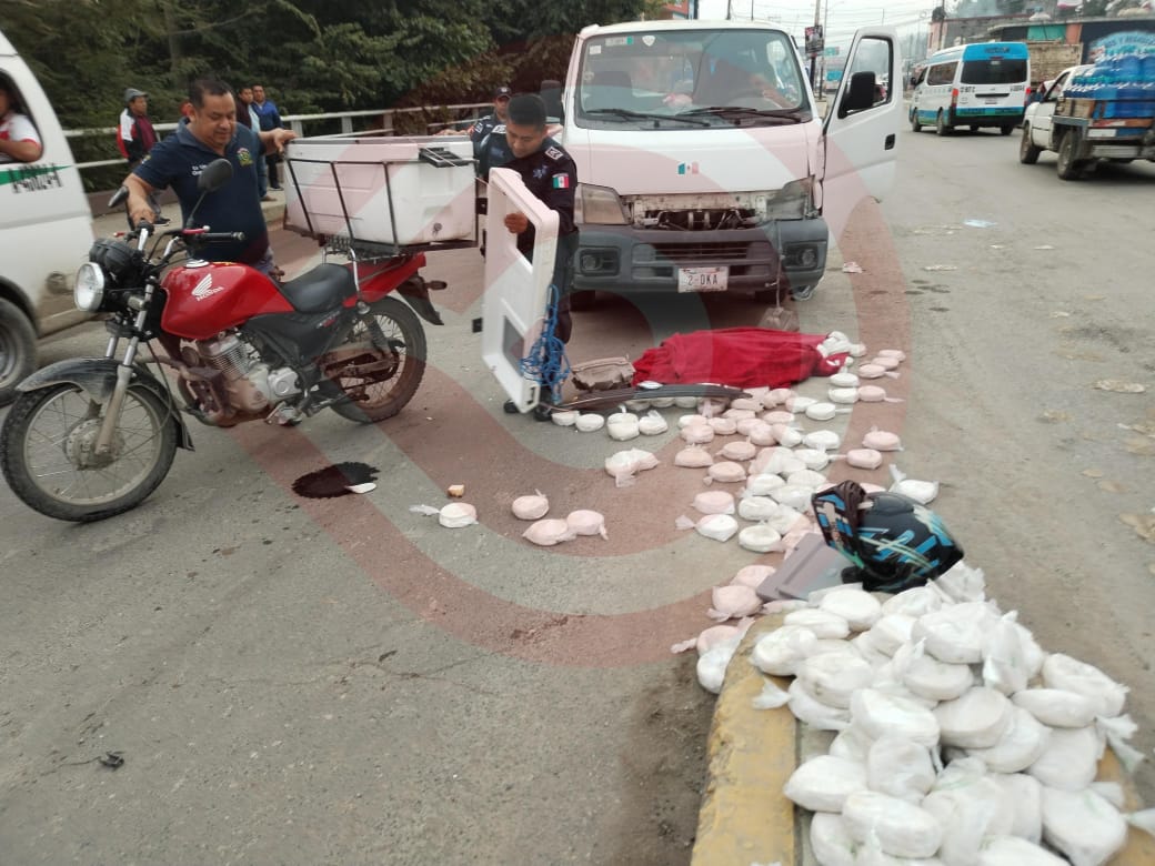 El suceso ocurrió la mañana del martes en las inmediaciones del mercado, donde el conductor de una urvan color blanco al transitar sobre el lugar atropelló al motociclista, quedando tendido en el pavimento así como varios kilos de tortillas y masa quedaron regados en la vía.