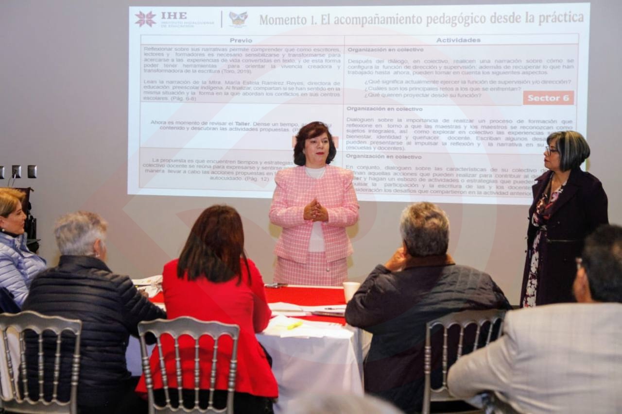 Al respecto, en seguimiento a las instrucciones de Natividad Castrejón Valdez, titular del IHE, Nancy Adriana León Vite, directora general de Educación Básica, informó que este lunes se realizará el Taller intensivo Reflexiones desde el acompañamiento pedagógico dirigido a personal con funciones de dirección.
