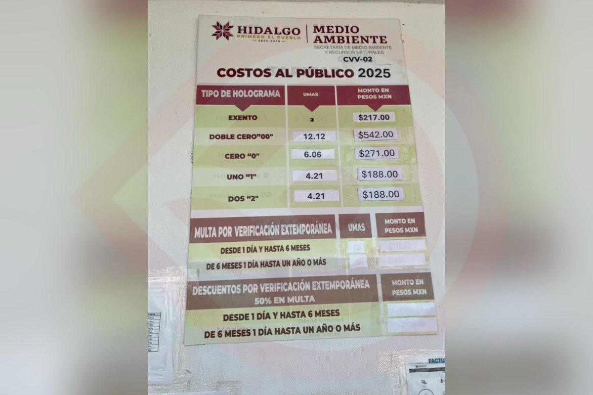 Los costos para realizar la verificación varían según el holograma, siendo los siguientes: Exento $217.00, Doble cero 00 $542.00, Cero 0 $271.00, Uno 1 $188.00, Dos 2 $188.00.
