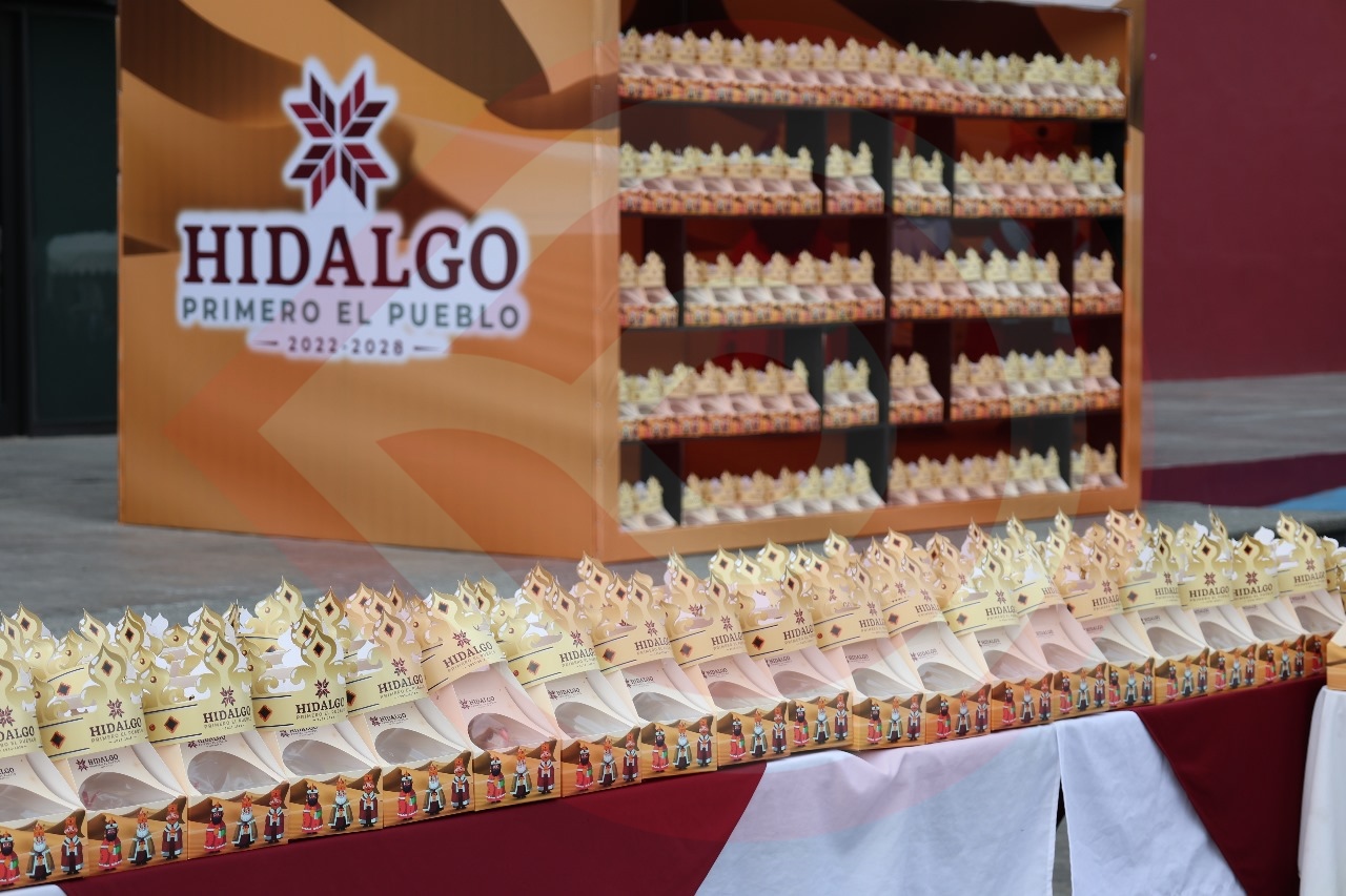 Pachuca, Hgo.- La presidenta del Patronato del Sistema DIFH, Edda Vite Ramos, y el gobernador de Hidalgo, Julio Menchaca Salazar, encabezaron la tradicional partida de Rosca de Reyes en Plaza Juárez, ocasión en la que se repartieron 8 mil cajas que incluyen una rosca individual, una leche y una corona de Reyes Magos.