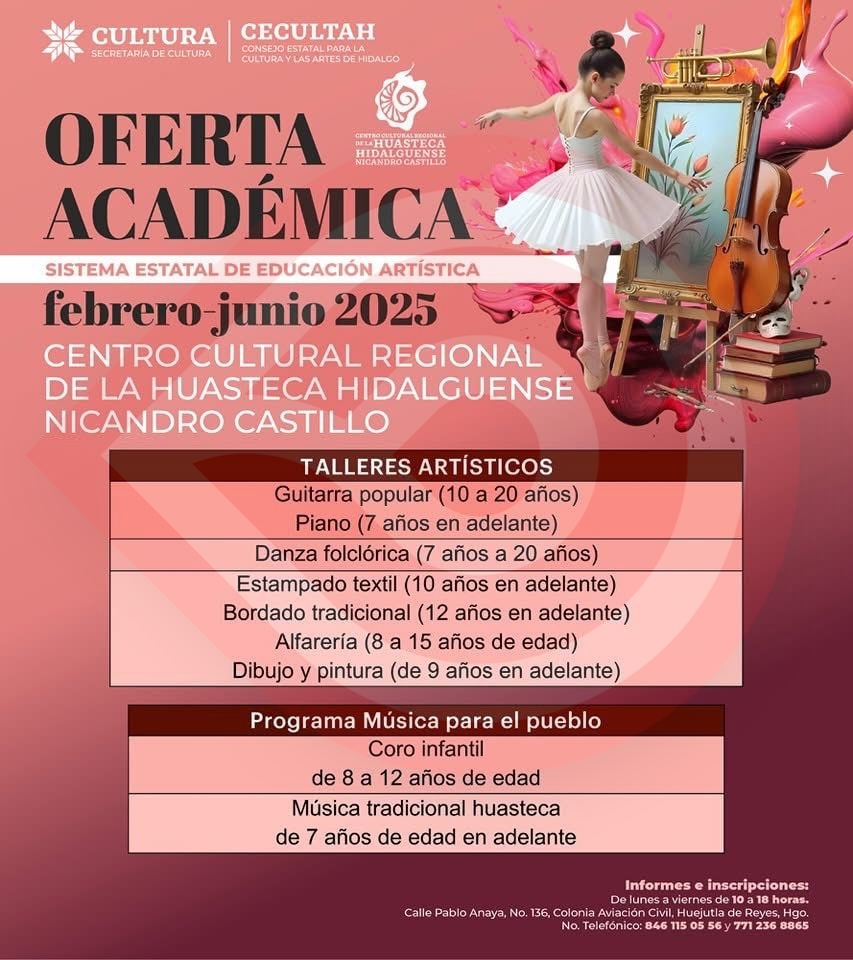 Huejutla, Hgo.- La coordinadora del Centro Cultural Regional de la Huasteca Hidalguense “Nicandro Castillo”, Karla Stephany Castro Flores manifestó en entrevista con Zunoticia que, las inscripciones están abiertas para el nuevo curso artístico (febrero – junio 2025).