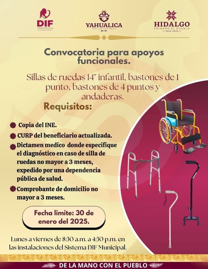 Yahualica, Hgo.- Considerando que los apoyos funcionales son recursos que ayudan a las personas con discapacidad a realizar actividades cotidianas, el Sistema DIF Municipal, que encabeza la E.E.Q, Arisbeth Hernández Lara, emite la convocatoria para la donación de estos.