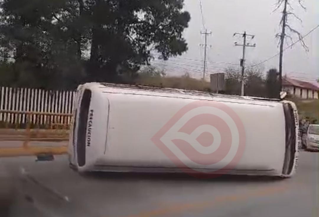 Zacualtipán de Ángeles, Hgo.- Una Urvan pasajera de la ruta Santa Teresa – Yahualica se volcó tras un choque múltiple que se registró sobre la vía federal México – Tampico, a la altura de la Universidad Tecnológica de la Sierra Hidalguense, dejando varios heridos y daños en miles de pesos, unidades de emergencia se dieron cita en el lugar para atender a los heridos.