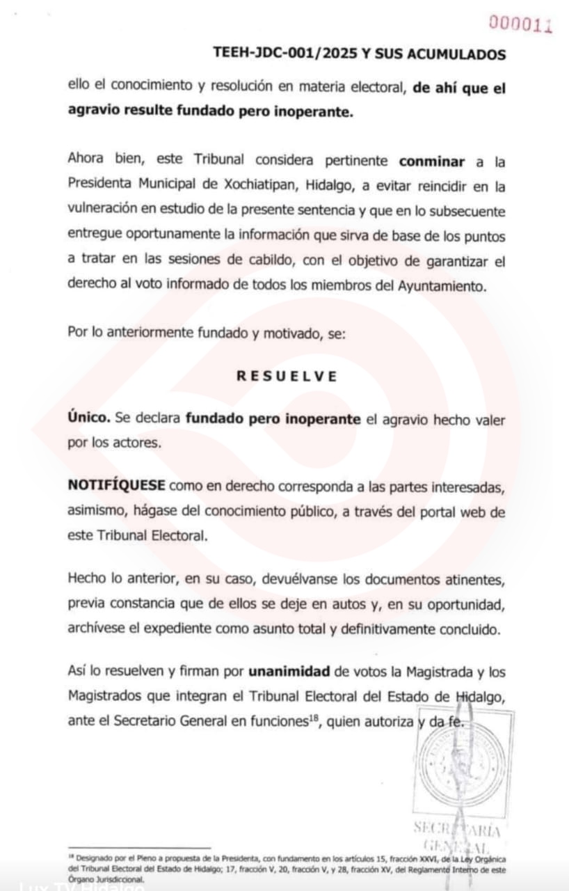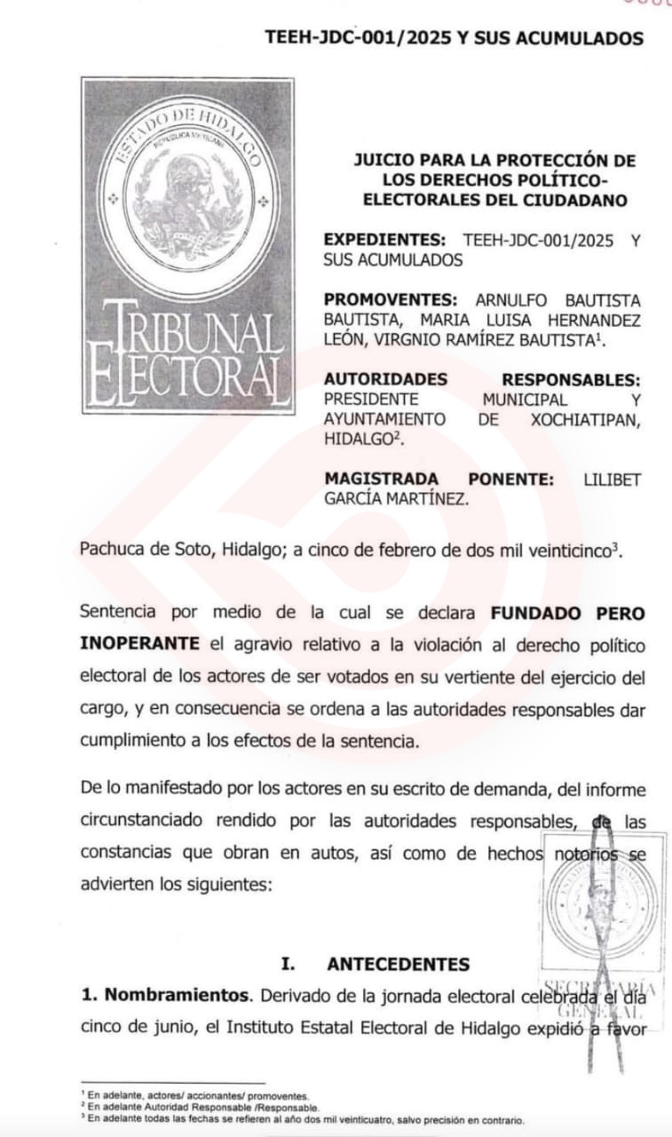 El TEEH recibió el documento de inconformidad por los denunciantes y se generó el oficio TEEH – JDC- 001 – 2025, en que la magistrada ponente Lilibet García Martínez revisó el caso y el 5 de febrero del presente año emitió la sentencia: Se declara Fundado pero Inoperante.