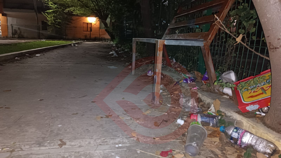 Este fin de semana se realizó una inspección ocular del área de esparcimiento del Parque de Poblamiento, donde al adentrarse en el área verde, se puede observar un reglamento del lugar, pero lo que llamó poderosamente nuestra atención fue la basura a lo largo del andador y la barda perimetral del área.