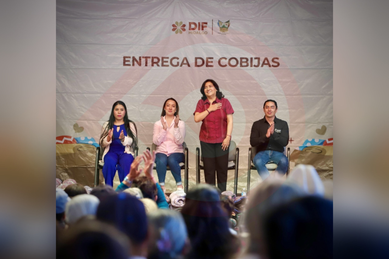 Acompañada de Luis Felipe Lugo Salinas, presidente municipal de Huasca de Ocampo, y Mónica Arriaga Iglesias, presidenta del SMDIF, Edda Vite llevó a cabo la entrega de los apoyos del programa “Este Invierno Abrígalo” a vecinas y vecinos de 16 comunidades que se dieron cita en el auditorio ejidal.
