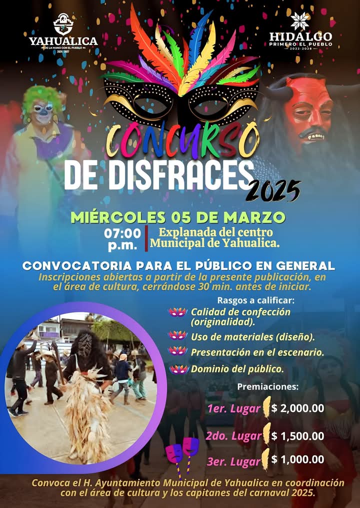 En el marco del magno evento, que tendrá efecto del 02 al 05 de marzo, sobresale un concurso de disfraces, cuya convocatoria y está vigente para el público en general, por lo que los interesados a participar deben de acudir a inscribirse al área de Cultura, la cual se cerrará 30 minutos antes del concurso que se llevará a cabo en la explanada de la presidencia municipal el 05 de febrero, a las 19:00 horas.