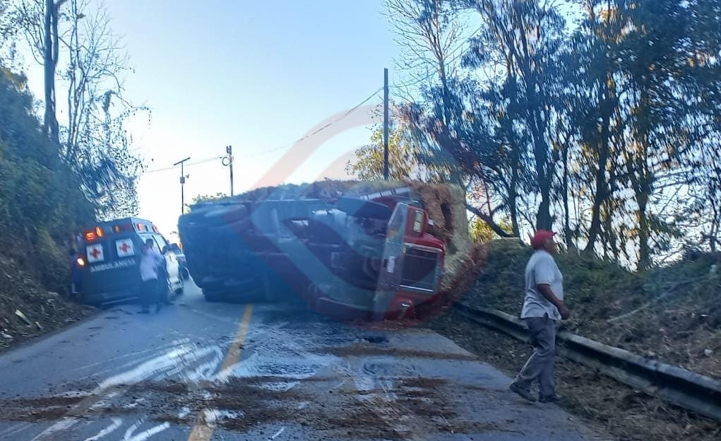 Molango, Hgo. – Un camión Torton se salió del camino y posteriormente volcó sobre la vía federal México-Tampico, en el Mirador Molango, dejando cuantiosos daños materiales; servicios de emergencia llegaron al lugar para auxiliar al chófer y otro tripulante.