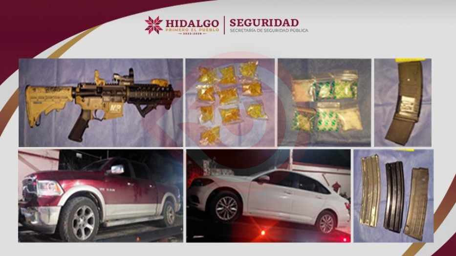 Durante las diligencias fueron asegurados un hombre que responde a las siglas B. R. A. S., presunto líder de la banda y una mujer de iniciales M. B. L. L., ambos originarios de la CDMX, así como un fusil semi automático calibre .223 listo para usarse, 40 cartuchos útiles, cinco cargadores abastecidos, 100 dosis de presunta marihuana, 20 dosis de sustancia granulada con características propias del cristal y tres celulares.