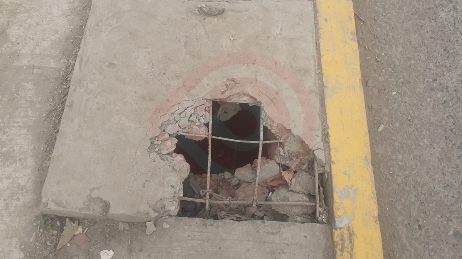 La tapa de concreto de la toma principal de la CAPASHH lleva años destrozada y está exactamente sobre la acera; es una de las calles más transitadas, ya que conecta a diferentes colonias del rumbo.