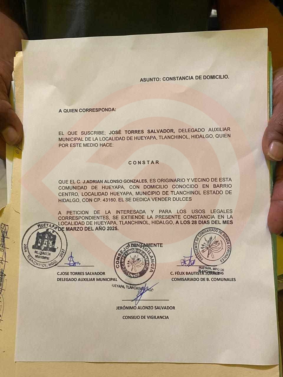 Lo anterior fue dado a conocer la tarde de este viernes mediante un escrito, en donde hace constar que J. Adrián Alonso González es originario y vecino de la comunidad de Hueyapa, con domicilio conocido en Barrio Centro, localidad de Hueyapa municipio de Tlanchinol, estado de Hidalgo y se dedica a vender dulces.