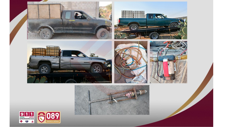 Las autoridades confiscaron además 42 contenedores de mil y 50 litros con rastros de haber sido utilizados para el trasiego ilegal de combustible, tres camionetas, todas con reporte de robo vigente, así como 50 dosis de presunta marihuana y 13 dosis de droga tipo “cristal”.