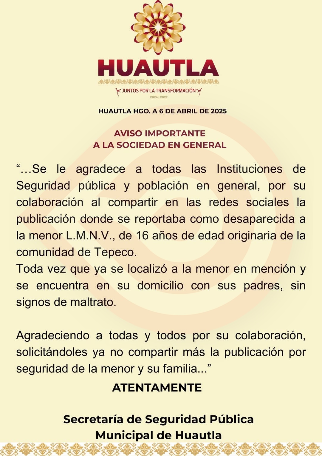 Huautla, Hgo.- Tras darse a conocer su desaparición y pedir ayuda a través de las redes sociales, el ayuntamiento municipal, en coordinación con Seguridad Pública, emitió un comunicado donde informó sobre la localización de L. M. de 16 años, originaria de la comunidad de Tepeco.