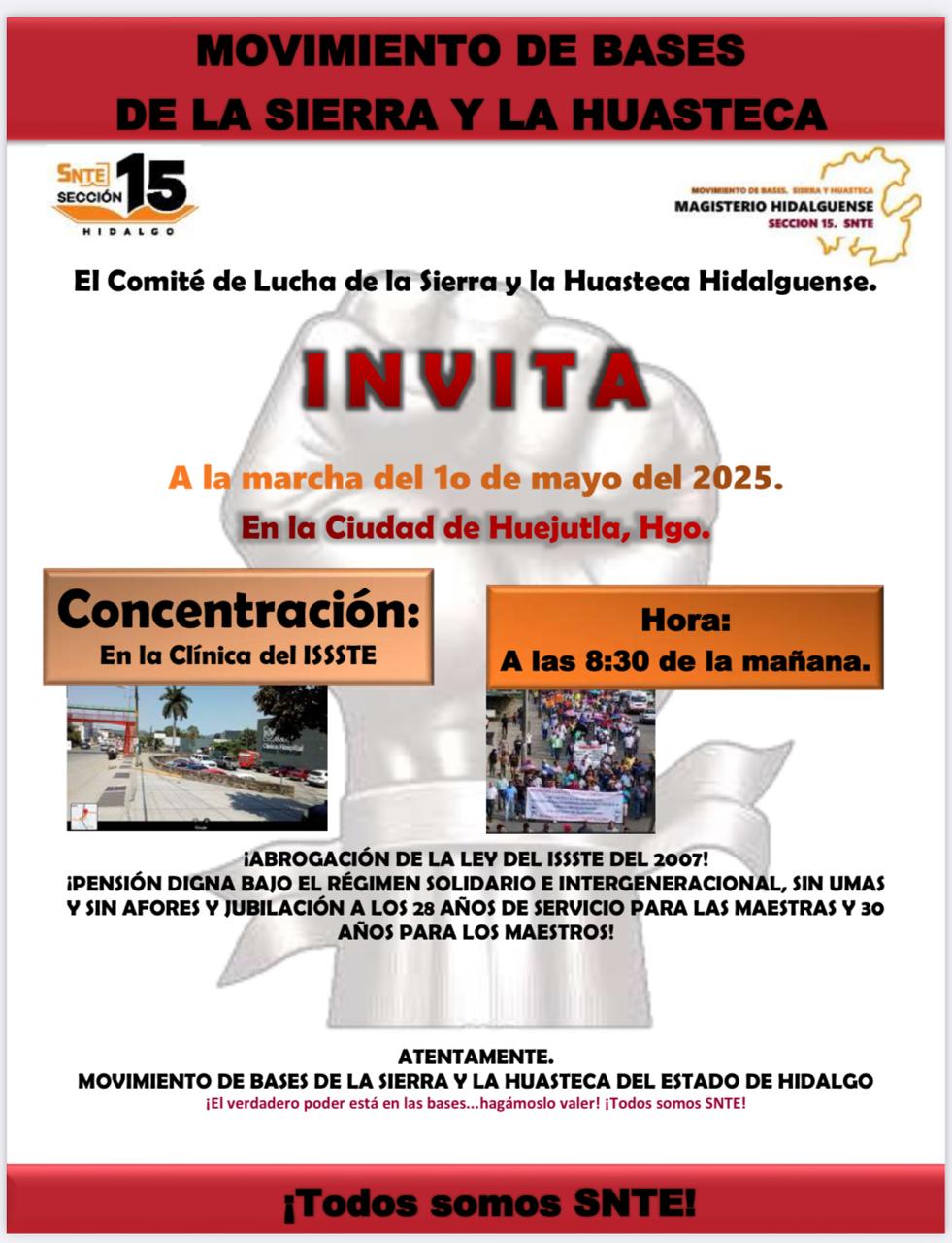 Por Enedino Hernández Alonso/Zunoticia Huejutla, Hgo.- Integrantes del Comité de Lucha del Movimiento de Bases del Magisterio de la Sierra y la Huasteca difunden el cartel para la marcha del primero de mayo, programada en esta ciudad de Huejutla. En el cartel se destaca que el Comité de Lucha de la Sierra y la Huasteca… Seguir leyendo Movimiento de Bases difunde el cartel para la marcha del primero de mayo