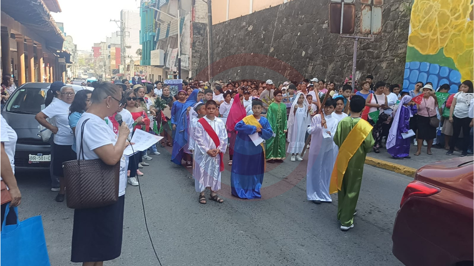 Los niños y padres de familia se concentraron en la Plazuela Juárez para realizar, después de las 09:00 horas, la representación del Viacrucis, en donde participaron los pequeños que acuden a las pláticas de Catecismo para Primera Comunión y Confirmación.