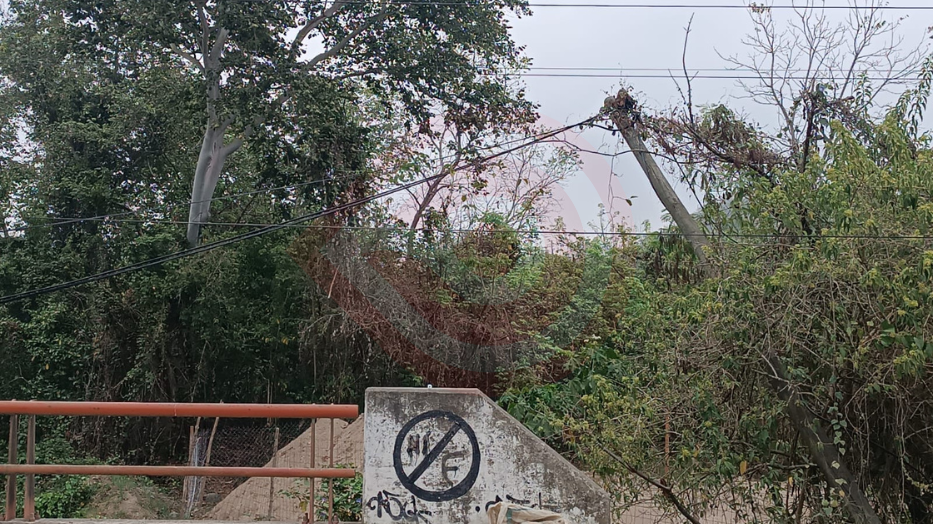 Clavado en la maleza que por su crecimiento ha echado ramas y enredadera sobre este poste, así como las inclemencias del tiempo han provocado que se vaya inclinando y esté a punto del colapso, lo que afectaría que se suspendieran varía líneas telefónicas y del servicio de internet; también pone en riesgo que se provoque un apagón, ya que se encuentra cerca de los conductores de energía eléctrica, además de poner el riesgo a los transeúntes.