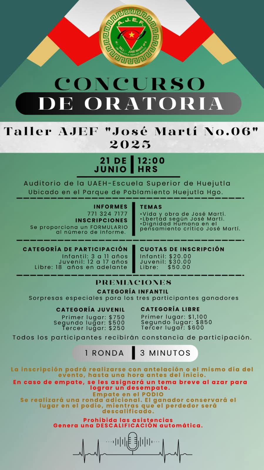 Las inscripciones se realizan en el número de teléfono 771 324 7177 y los temas que pueden abordarse son: Vida y obra de José Martí, Libertad según José Marti, así como Dignidad Humana en el pensamiento crítico José Martí.