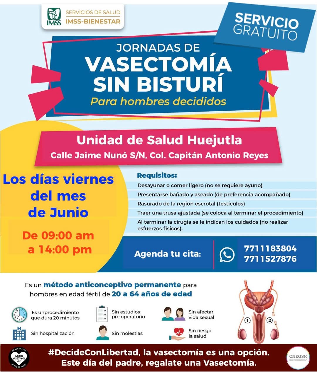 Huejutla, Hgo. – Los Servicios de Salud IMSS – Bienestar invitan a los ciudadanos a participar en las jornadas gratuitas de vasectomía sin bisturí, que se llevan a cabo los días viernes del mes de junio, en horario de 9:00 am a 2:00 pm, en la Unidad de Salud Huejutla que se ubica en calle Jaime Nunó S/N, colonia Capitán Antonio Reyes.