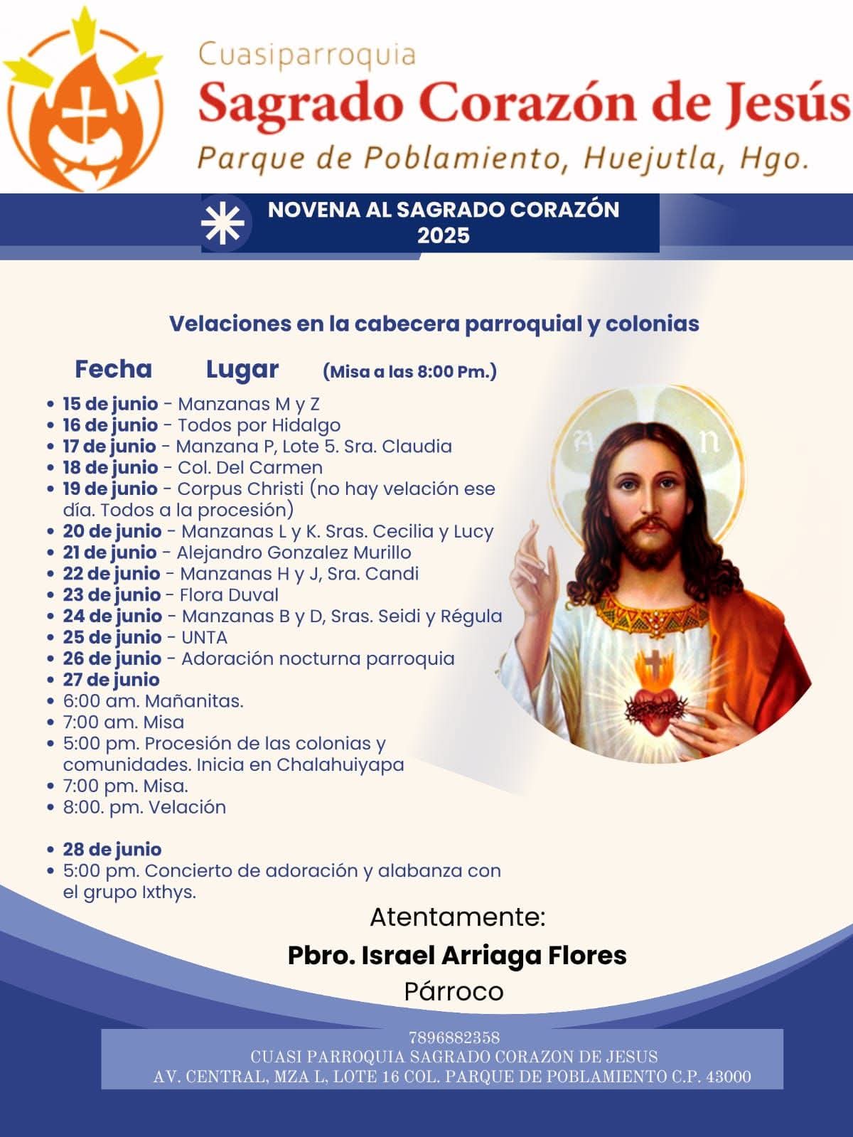 La Cuasiparroquia Sagrado Corazón de Jesús, a cargo del párroco Ismael Arriaga Flores, invita a todos los feligreses a participar en las velaciones y celebrar con alegría la fiesta patronal.