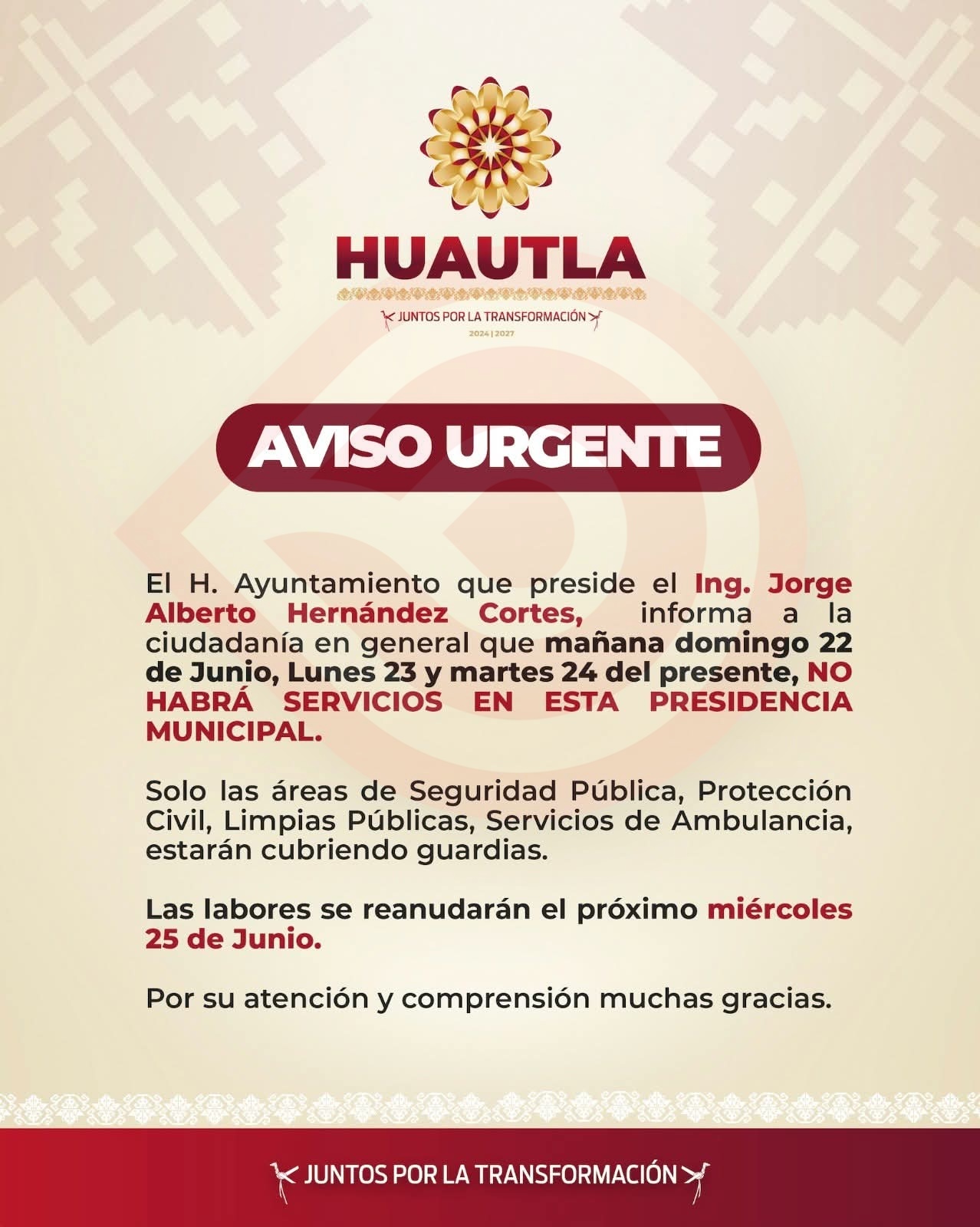 Huautla, Hgo.- A través de un comunicado se dio a conocer que, del 22 al 24 de junio del año en curso se suspenderán las actividades y trámites en la administración.