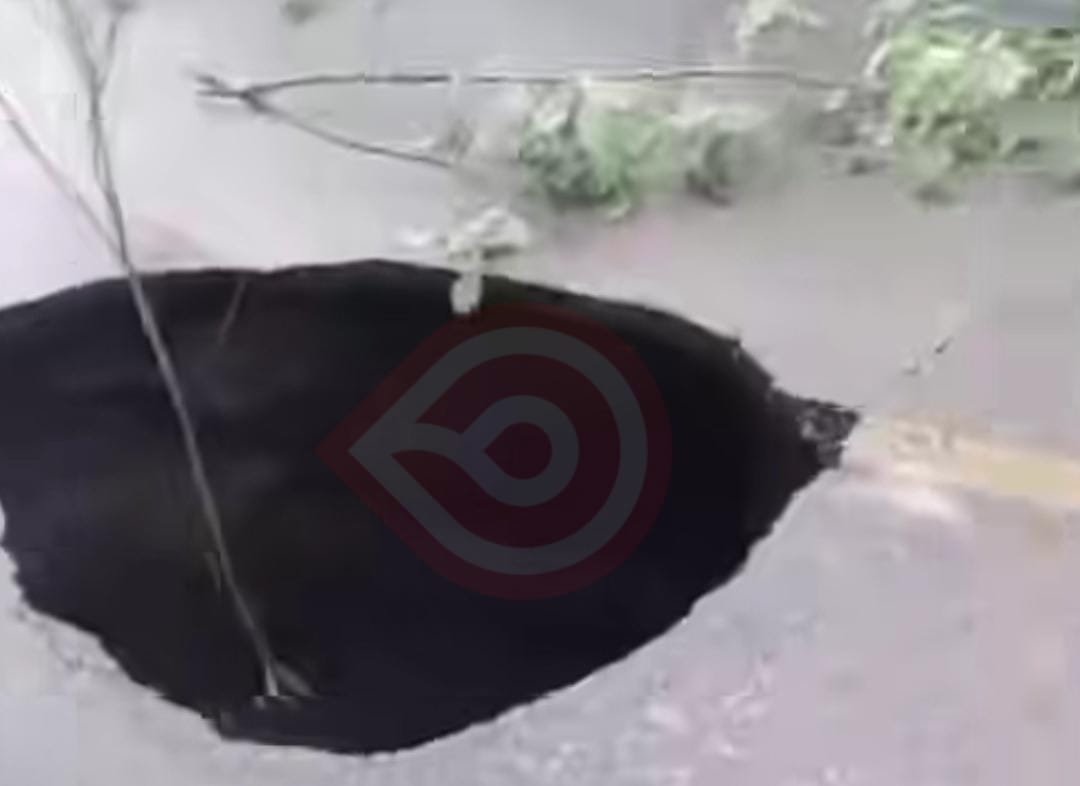 El socavón se abrió como producto de las intensas lluvias que se registraron en los últimos días, el hueco de alrededor de dos metros de diámetro se extendió en los dos carriles y la tierra con el paso del tiempo se abrirá más, por ello que quedó bloqueado esa importante vía.