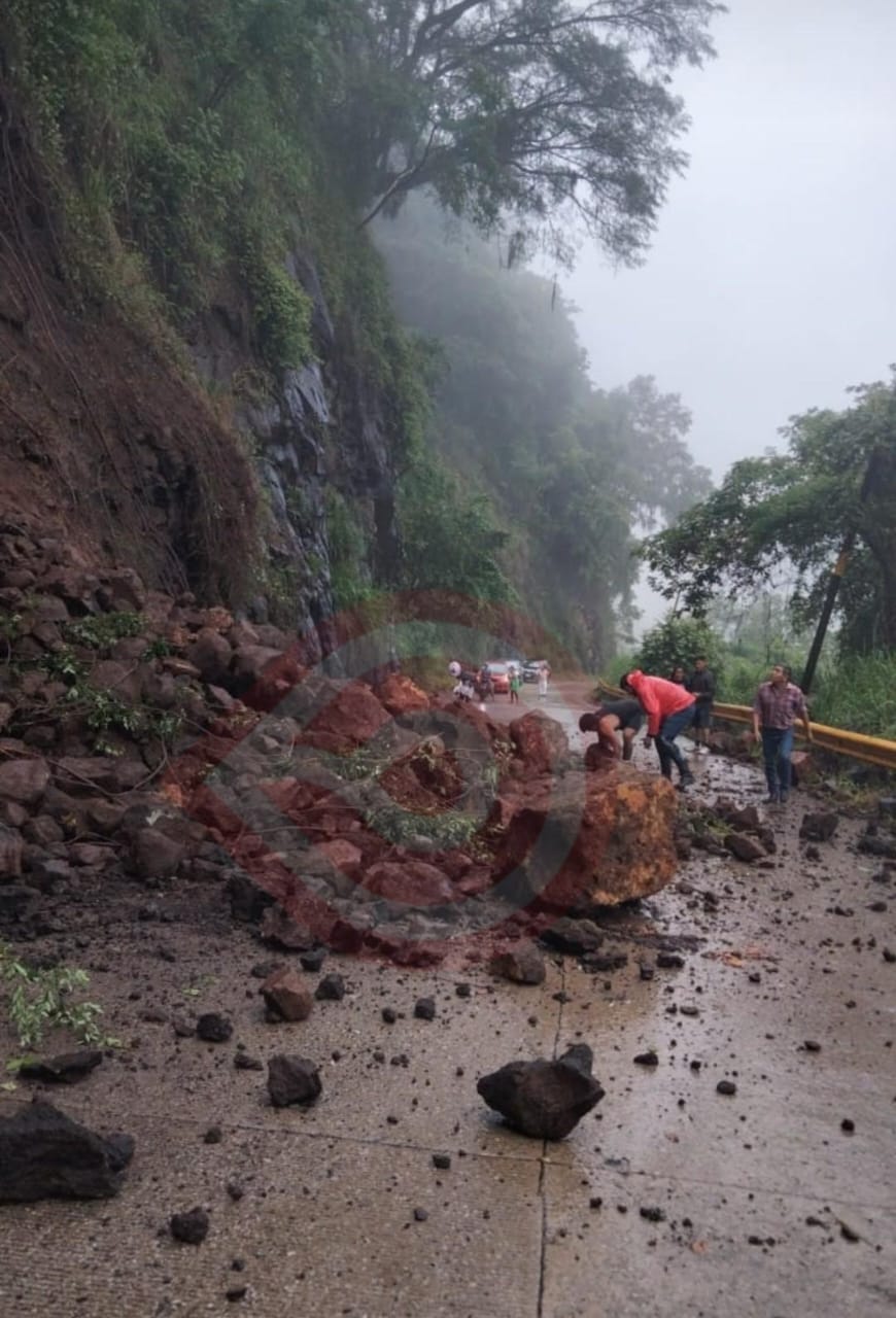 Huautla, Hgo. – Un derrumbe que se registró sobre la vía estatal Atlapexco – Huautla, bloqueó esa vía en sus dos carriles, voluntarios iniciaron el retiro de piedras para abrir un carril y el libre tránsito.