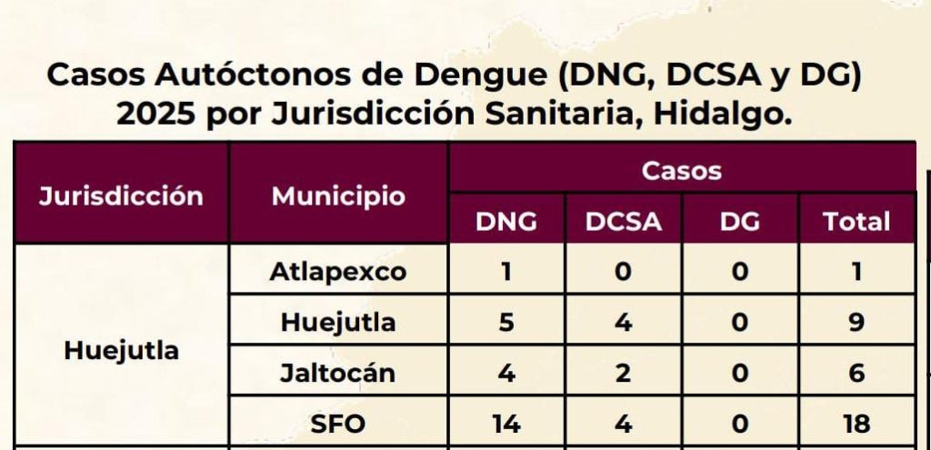 El jefe de la Jurisdicción Sanitaria 04 en Huejutla de Reyes, Jesús Rodríguez Ortega; confirma que hasta la semana 26 con cierre al 30 de junio del 2025, y de acuerdo con la información que se tiene en el boletín de Arbovirosis, al momento el dengue ya mantiene presencia en cuatro municipios de la Huasteca.