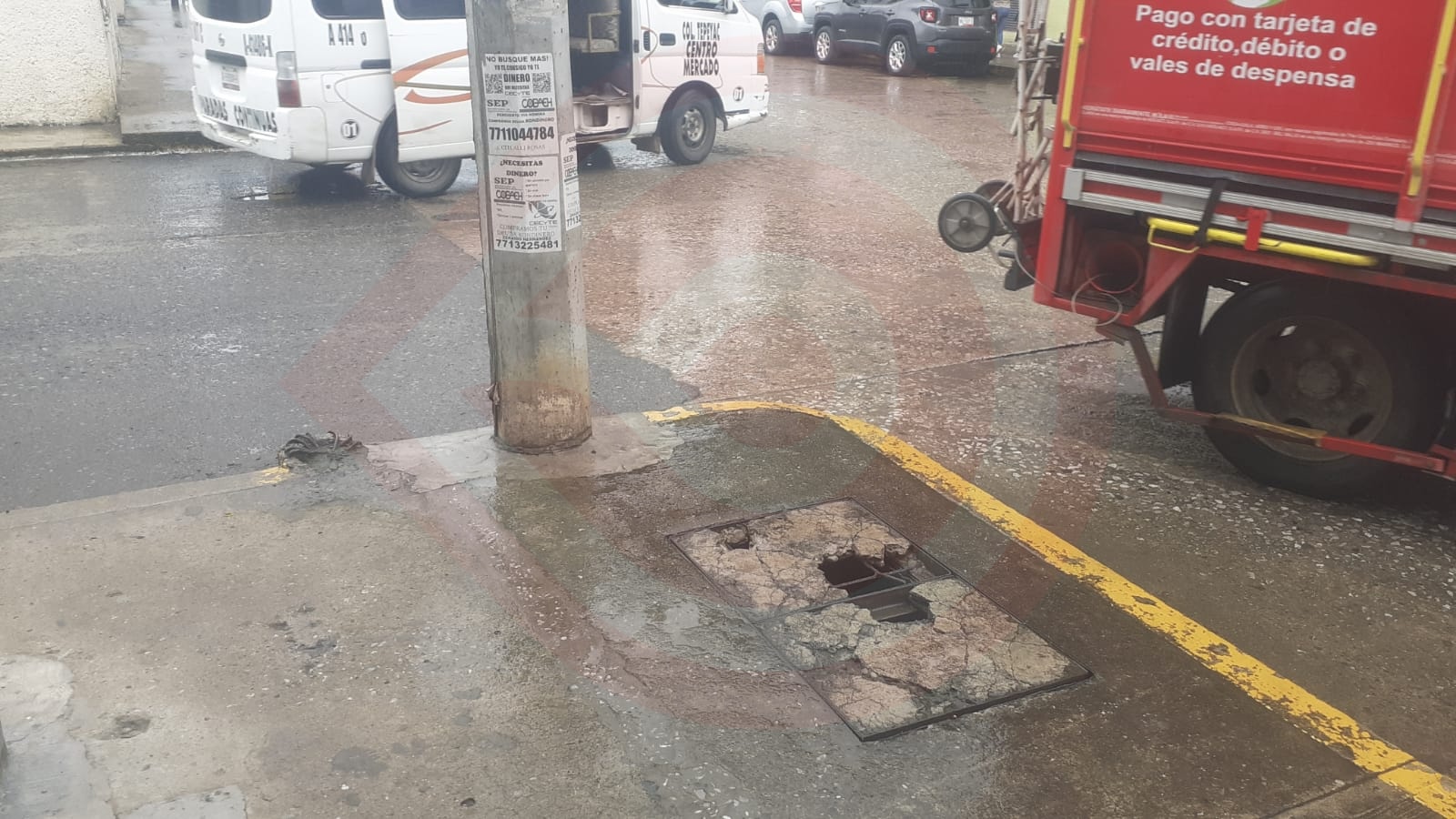 La tapa de registro referida está ubicada exactamente donde se encuentran los semáforos, en la banqueta junto a conocida funeraria, en dicha acera se observa la tapa colapsada, con dos perforaciones y la base de un poste de concreto, propiedad de la Comisión Federal de Electricidad (CFE), la cual sobresale de la banqueta, ambos objetos representan un peligro para los peatones que transitan por la acera de los semáforos de Tecoluco de esta ciudad.