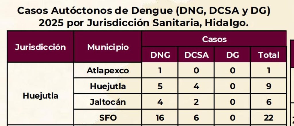 Asimismo, explica que, de estos 38 casos positivos de dengue que se tienen en la región de la huasteca, se distribuyen de la siguiente manera en los municipios de Atlapexco con uno, Huejutla de Reyes nueve, Jaltocán seis y San Felipe Orizatlán avanza con 22.
