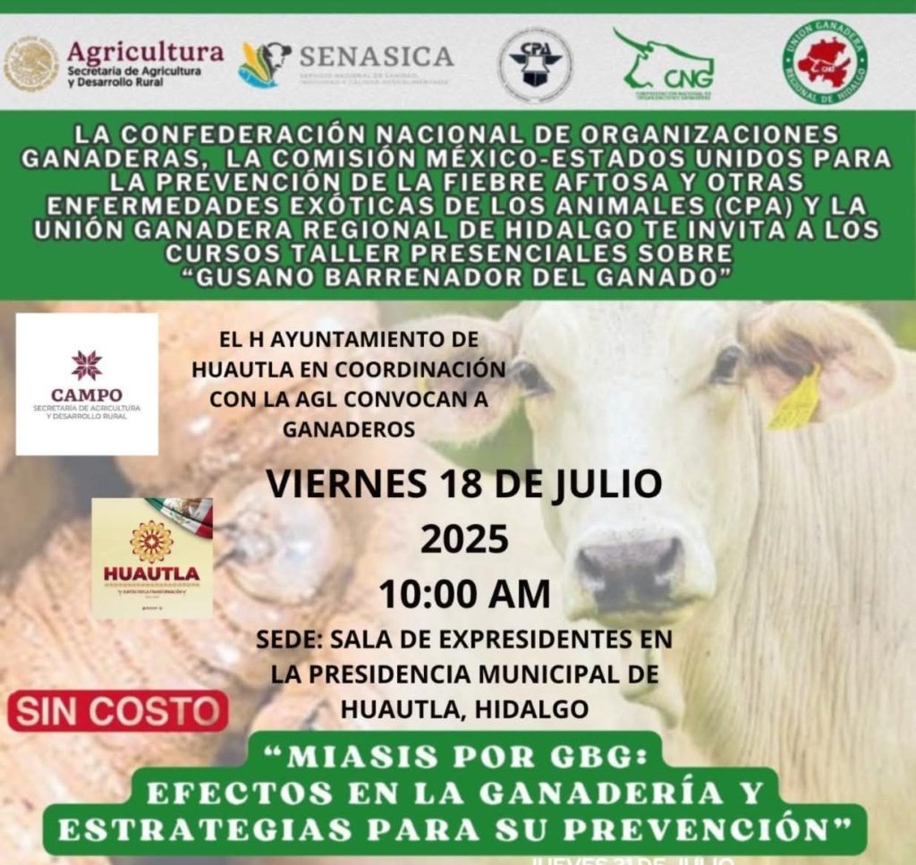 Huautla, Hgo.– Con el objetivo de proteger la salud del ganado y evitar pérdidas económicas en el sector pecuario, el Secretario de Agricultura y Desarrollo Rural Municipal, David Cortés Hernández, hizo una invitación a los ganaderos, así como a los delegados de barrios, colonias y comunidades del municipio, para asistir a una capacitación sobre el reconocimiento, prevención y control del gusano barrenador.