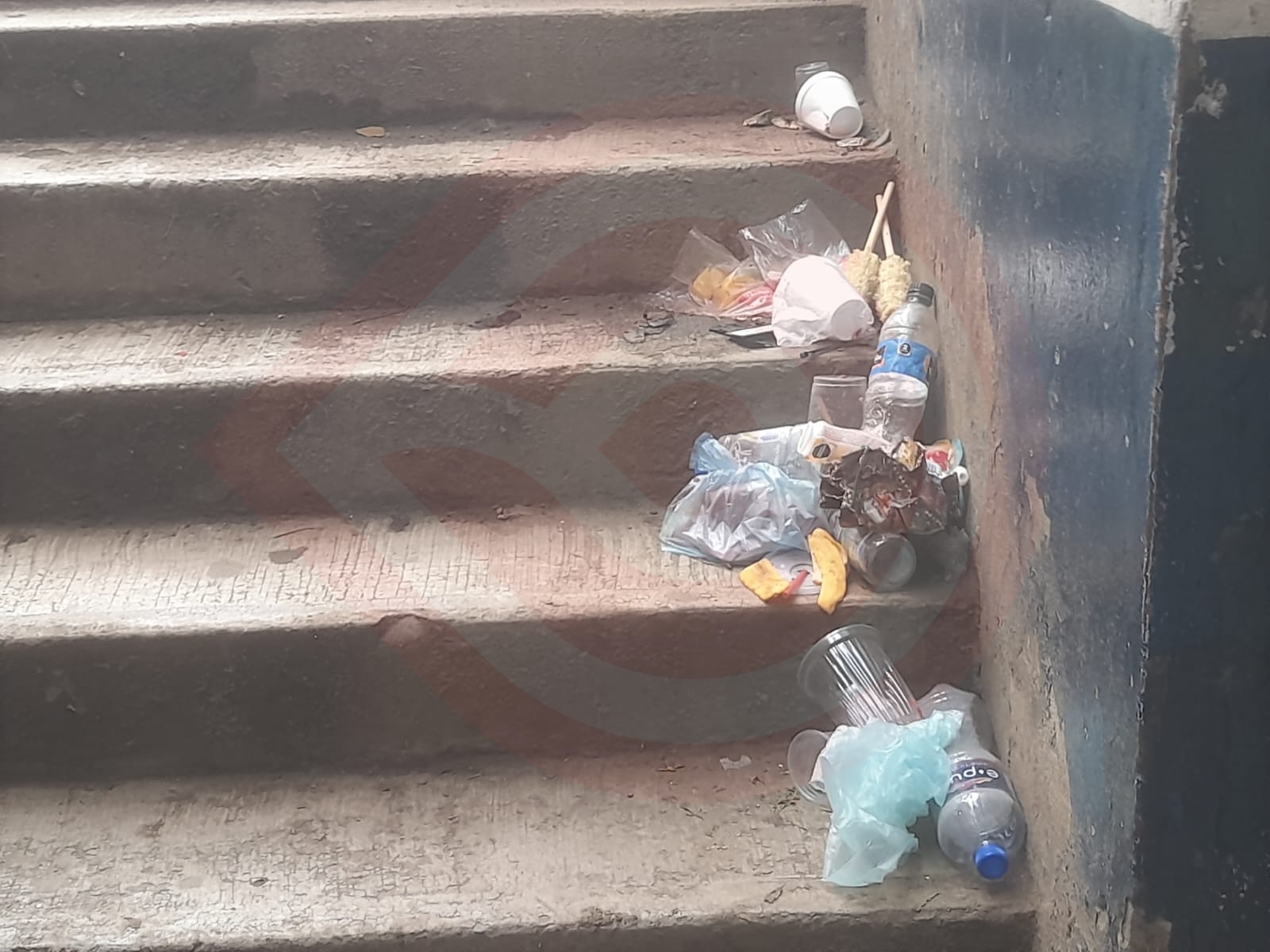 Huejutla, Hgo.- Locatarios establecidos en la Plaza del Maíz manifestaron que, los días de tianguis el acceso de las escaleras siempre está, desde temprano, con basura generada por consumo de alimentos.