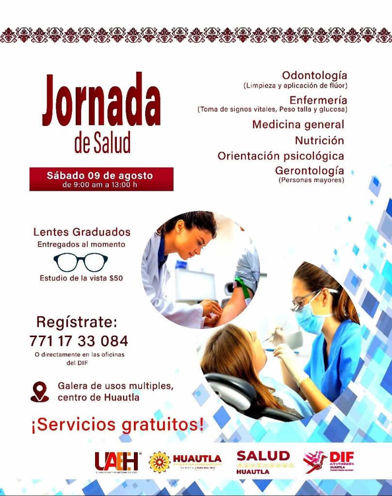 Huautla, Hgo.- El próximo sábado 9 de agosto en horario de 9:00 a 13:00 horas, se estará llevando a cabo una Jornada de Salud en la galera de usos múltiples, con la finalidad de acercar las diferentes especialidades a la población.