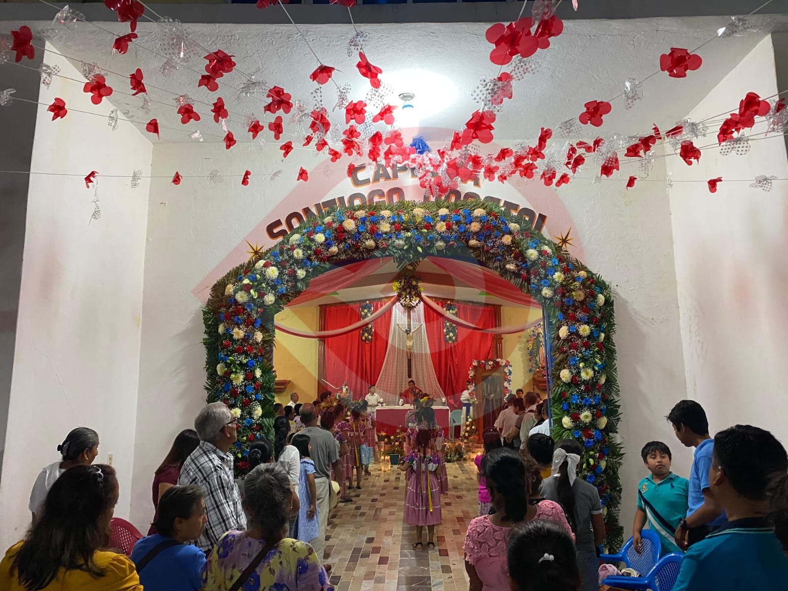 En punto de las 9:00 pm dió inicio la sagrada eucaristía, en un ambiente de alegría de los feligreses que abarrotaron el interior, y el atrio de la capilla, así como una parte de la calle principal Emiliano Zapata la cual permaneció cerrada para la circulación de automóviles en un tramo comprendió de 400 metros aproximadamente, dónde se colocaron sillas para la concurrencia, así como para los puestos que ofrecieron principalmente alimentos.