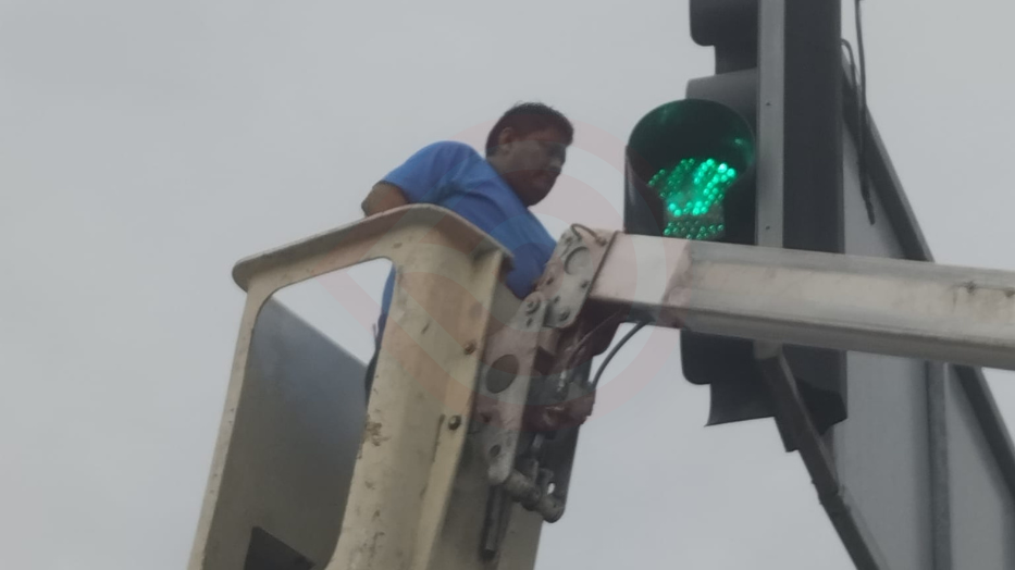 Cambian foco fundido en cruce de semáforos