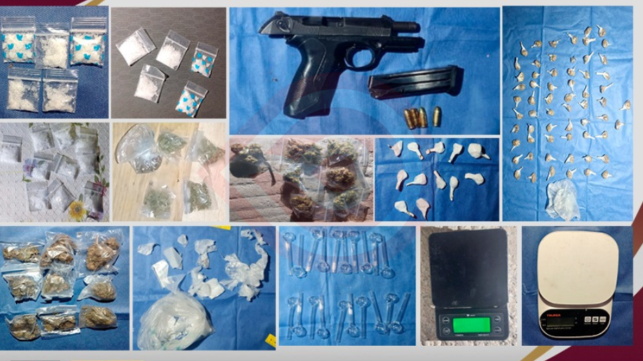 Los trabajos de seguridad realizados dieron como resultado la detención de cinco hombres y una mujer, a quienes les aseguraron un total de 447 dosis de hierba seca con características propias de la marihuana, 107 dosis de droga sintética “cristal”, 22 pipas, básculas de precisión y bolsas para la dosificación de narcóticos.