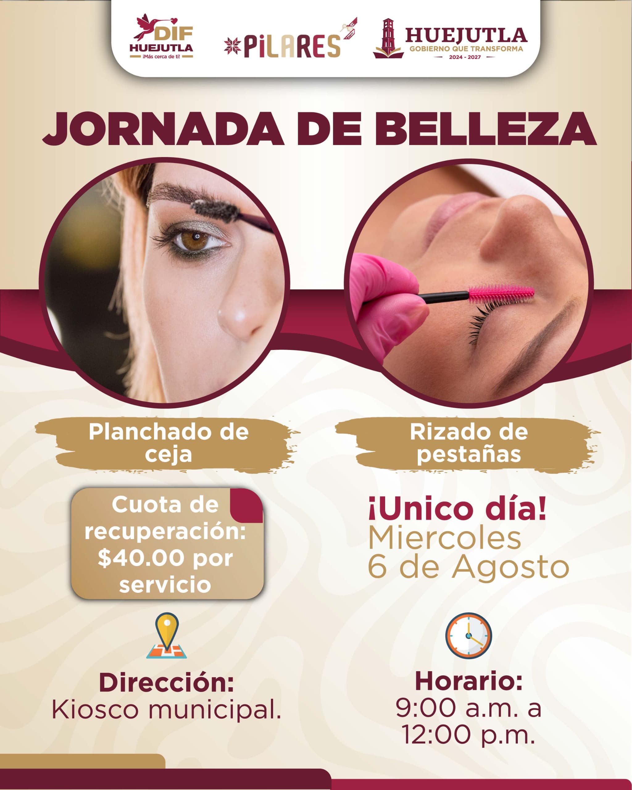 Huejutla, Hgo. – El Sistema DIF Huejutla, en coordinación con el Centro Pilares, invita a la población en general a participar en la Jornada de Belleza, donde madres de familia brindarán servicios de planchado de ceja y rizado de pestañas.