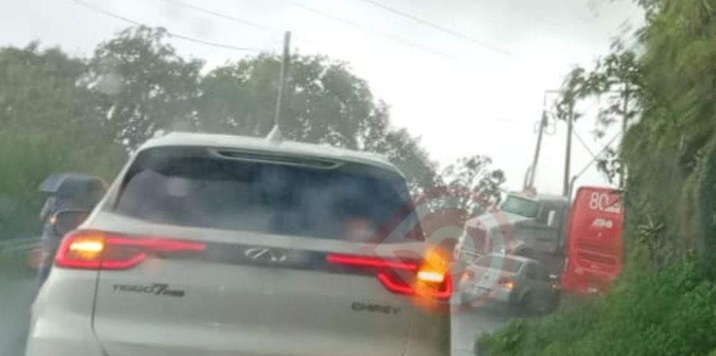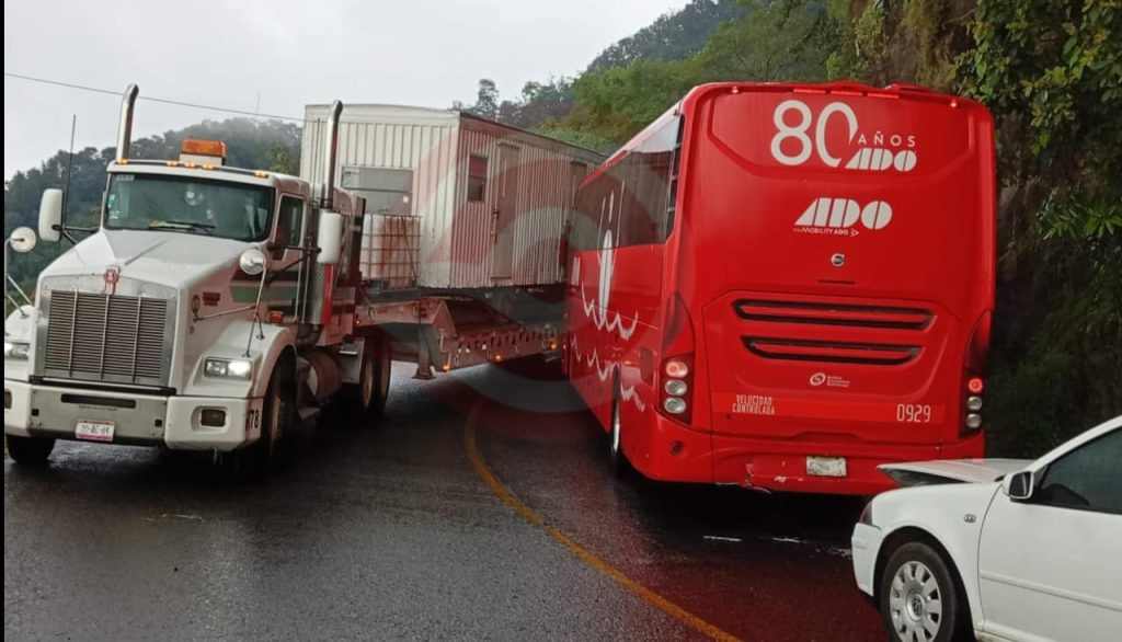 El accidente se registró en El Cantil, donde un tráiler invadió carril contrario e impactó un autobús; mientras que el conductor de un automóvil tipo Jetta color blanco, al no llevar su distancia también terminó impactado en la parte trasera del autobús.