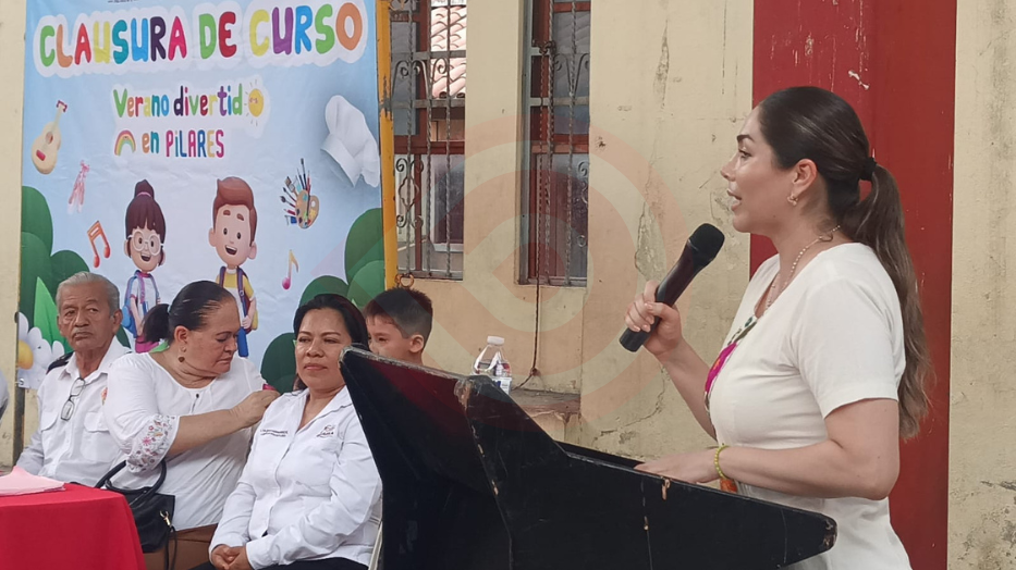 Huejutla, Hgo.- La presidenta del Sistema Municipal para el Desarrollo Integral de la Familia (SMDIF) Huejutla, Hilda Kristel Rodríguez Flores, refrendó su compromiso con la sociedad huejutlense al clausurar, la mañana de este lunes 11 de agosto, los Cursos de Verano Divertido en Pilares, evento en donde fue acompañada por el alcalde, Alfredo San Román.